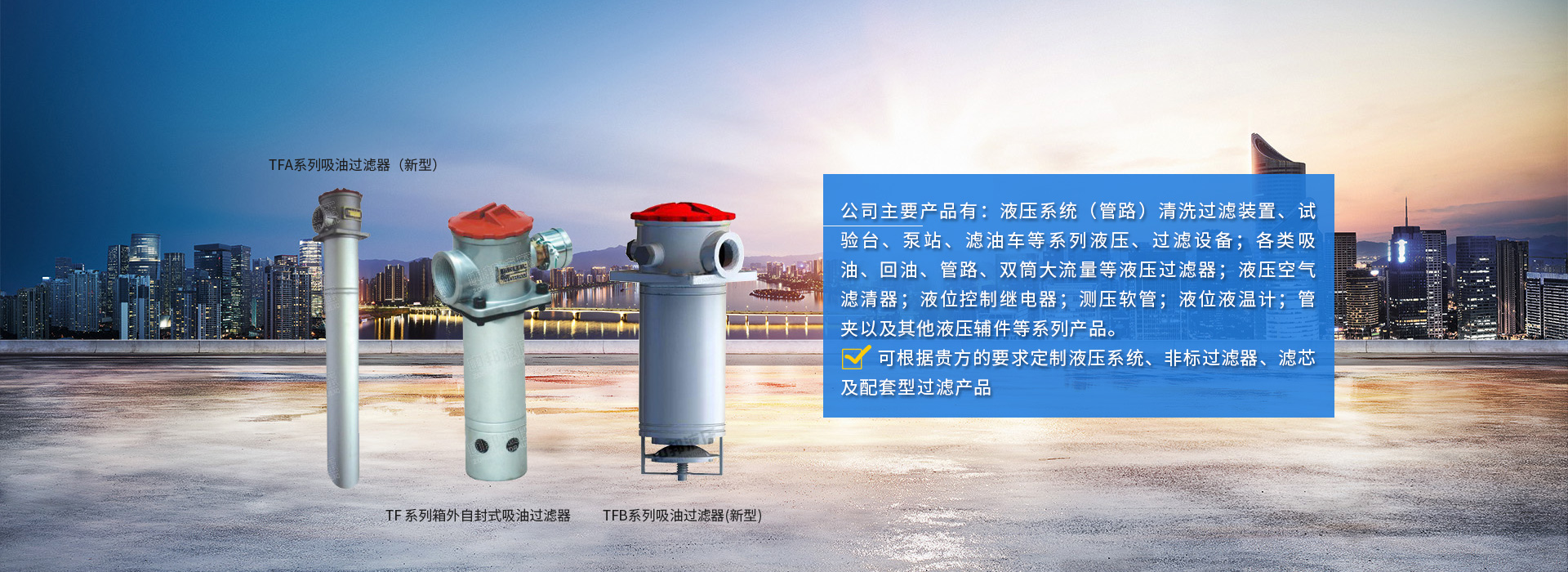 公司主要產品有:液壓系統(管路)清洗過濾裝置、試驗臺、泵站、濾油車等系列液壓、過濾設備:各類吸油、回油、管路、雙筒大流里等液壓過濾器;液壓空氣濾清器;液位控制維電器;測壓軟管;液位液溫計;管夾以及其他液壓輔件等系列產品。也可根據貴方的要求定制液壓系統、非標過濾器、濾芯及配套型過濾產......